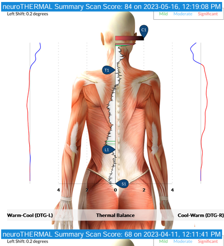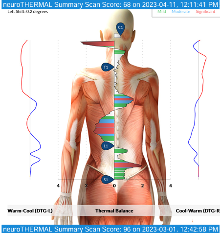The first scan is the Neuro Thermal scan. We can run this scan on anyone and everyone as it is non-invasive and is looking at thermo regulation along the spine. So whether you are 1 hour old, to 100 years old, or even pregnant – this scan will help us to locate and quantify the stress and overwhelm the nervous system